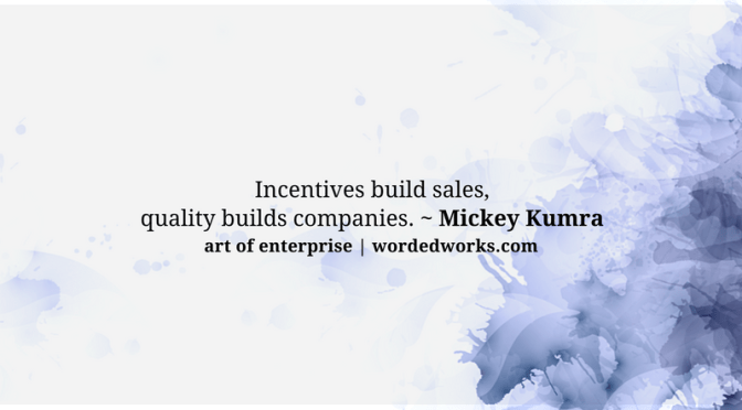 All, Art Of Enterprise Art Of Enterprise | Focus April 25, 2018 Mickey Kumra Subscribe to emails Quality people, quality products, quality processes, quality service. Incentives build sales, quality builds companies. ~ Mickey Kumra Subscribe to Blog via Email Enter your email address to subscribe to this blog and receive notifications of new posts by email. Email Address: Subscribe Share This | Click relevant icons Click to share on Facebook (Opens in new window) Facebook Click to share on X (Opens in new window) X Click to share on WhatsApp (Opens in new window) WhatsApp Click to share on Pinterest (Opens in new window) Pinterest Click to share on Tumblr (Opens in new window) Tumblr Click to email a link to a friend (Opens in new window) Email More Click to share on Reddit (Opens in new window) Reddit Click to share on LinkedIn (Opens in new window) LinkedIn Click to share on Pocket (Opens in new window) Pocket Click to share on Telegram (Opens in new window) Telegram