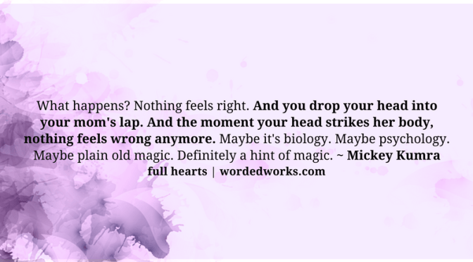 What happens? Nothing feels right. And you drop your head into your mom’s lap. And the moment your head strikes her body, nothing feels wrong anymore. Maybe it’s biology. Maybe psychology. Maybe plain old magic. Definitely a hint of magic. ~ Mickey Kumra